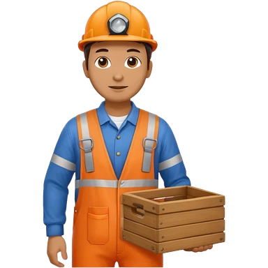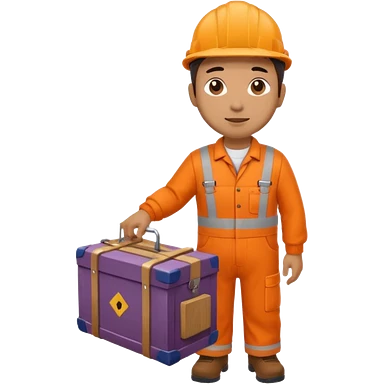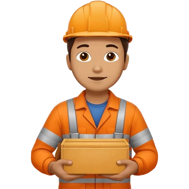 emoji style railway engineer full body in orange overalls, carrying a box in front of them emoji
