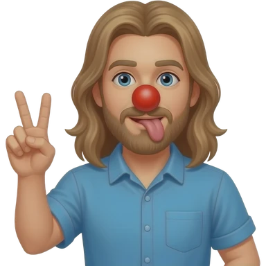 Very long light Brown hair behind the back on a man in blue shirt throwing a peace sign with beard Licking butt with red foam clown nose in Apple person emoji format emoji