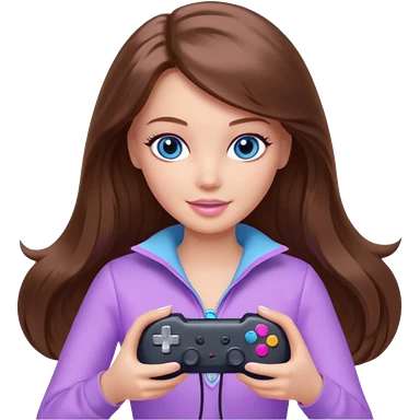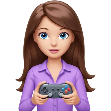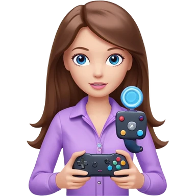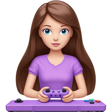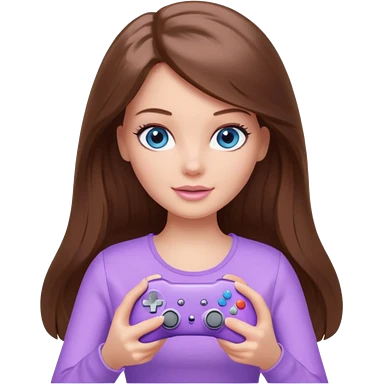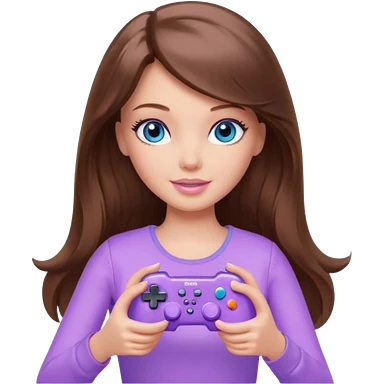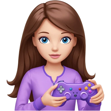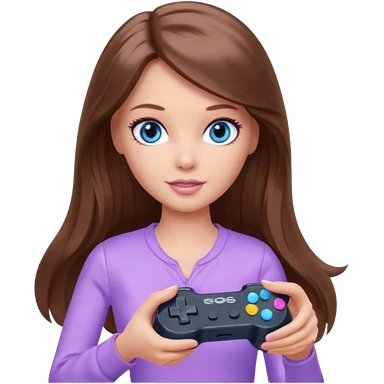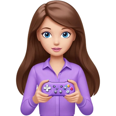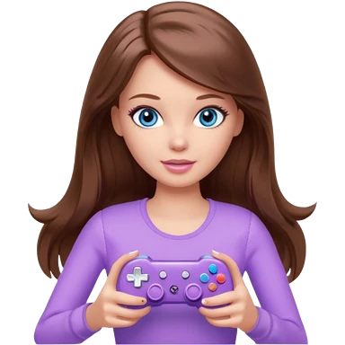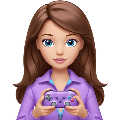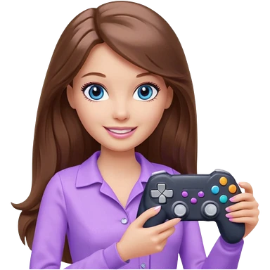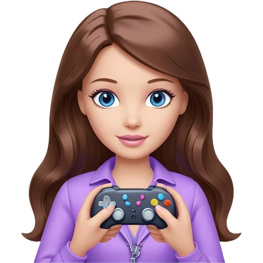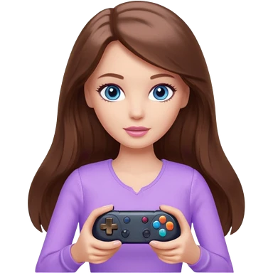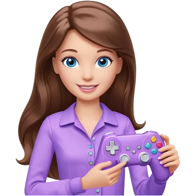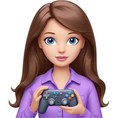 beautiful barbie girl with long brown hair, blue eyes and wearing light purple clothes playing console games with controller emoji