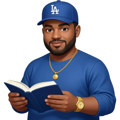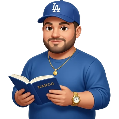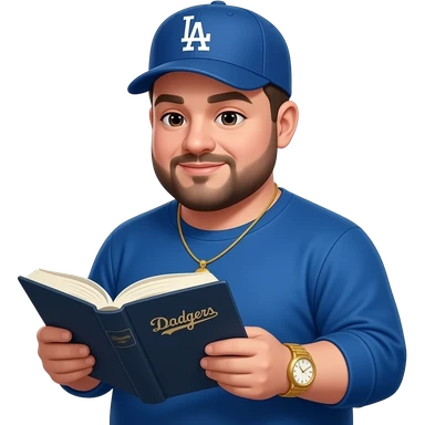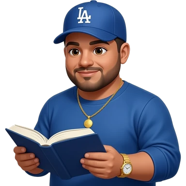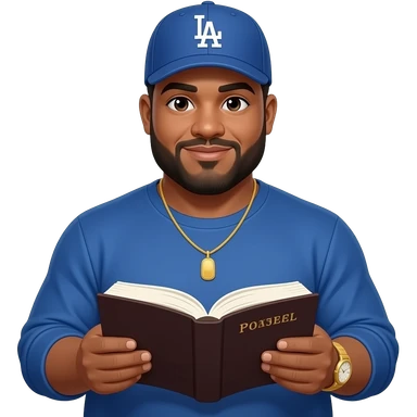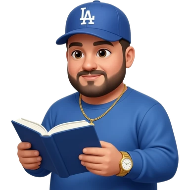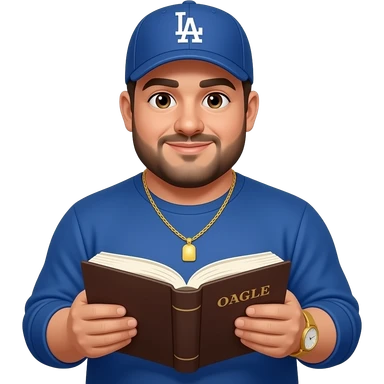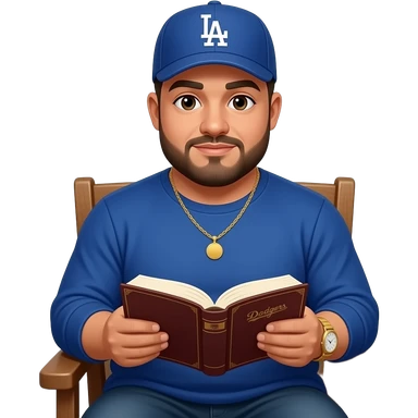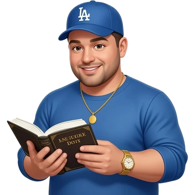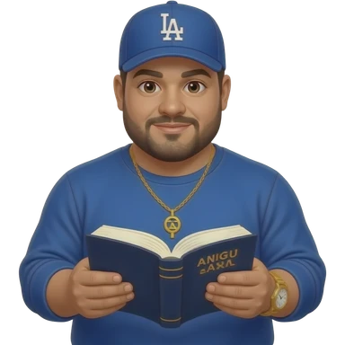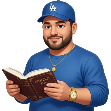 Chubby man with light honey skin tone and lightly shaved black beard wearing a blue Los Angeles Dodgers logo baseball cap wearing a long sleeve blue shirt wearing a gold tennis necklace and a gold wrist watch reading a Bible emoji