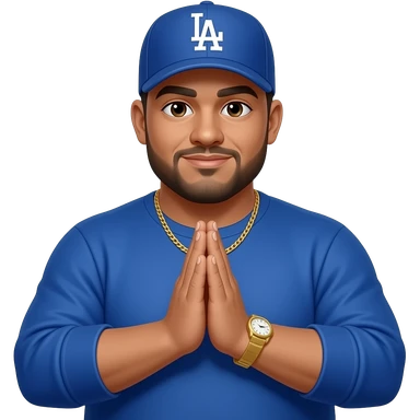 Chubby man with sand skin tone and lightly shaved black beard wearing a blue Los Angeles Dodgers logo baseball cap wearing a long sleeve blue shirt wearing a gold tennis necklace and a gold wrist watch with his prayer hands emoji