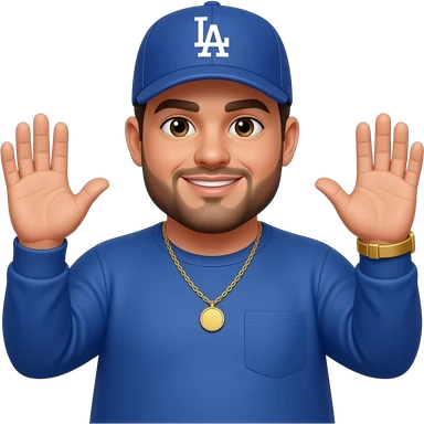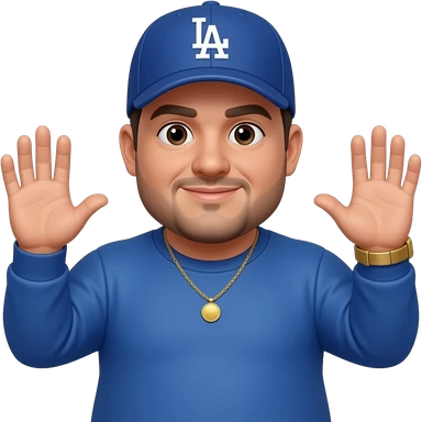 Chubby man with sand skin tone and lightly shaved black beard wearing a blue Los Angeles Dodgers logo baseball cap wearing a long sleeve blue shirt wearing a gold tennis necklace and a gold wrist watch with his hands up emoji