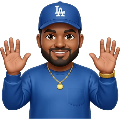 Man with honey skin tone and lightly shaved black beard wearing a blue Los Angeles Dodgers logo baseball cap wearing a long sleeve blue shirt wearing a gold tennis necklace and a gold wrist watch with his hands up emoji