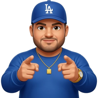Chubby man with light honey skin tone and lightly shaved black beard wearing a blue Los Angeles Dodgers logo baseball cap wearing a long sleeve blue shirt wearing a gold tennis necklace and a gold wrist watch with hands making a gun pointing forward emoji