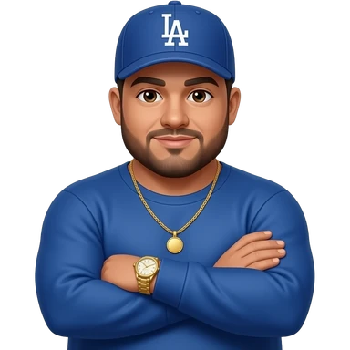 Chubby man with light honey skin tone and lightly shaved black beard wearing a blue Los Angeles Dodgers logo baseball cap wearing a long sleeve blue shirt wearing a gold tennis necklace and a gold wrist watch with arms folded emoji