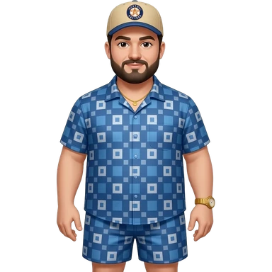 Chubby man with beige skin tone with lightly shaved black beard wearing a blue button down short sleeve shirt with matching shorts with square pattern designs wearing a beige Huston Astros logo baseball cap wearing a gold tennis necklace and a gold wrist watch emoji