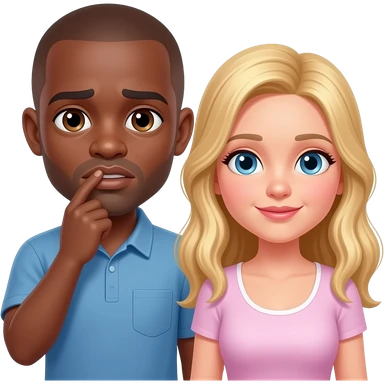 Black man with shaved head saying sorry to his blonde girlfriend emoji