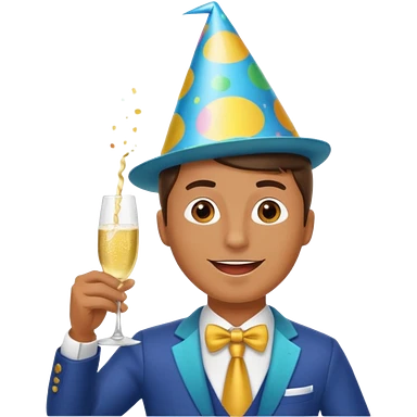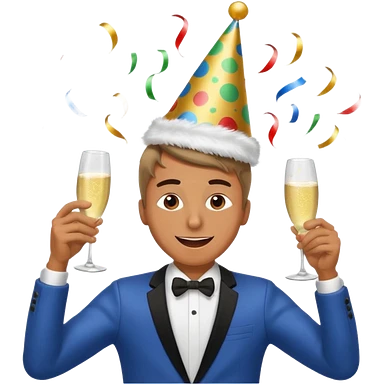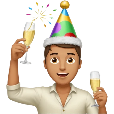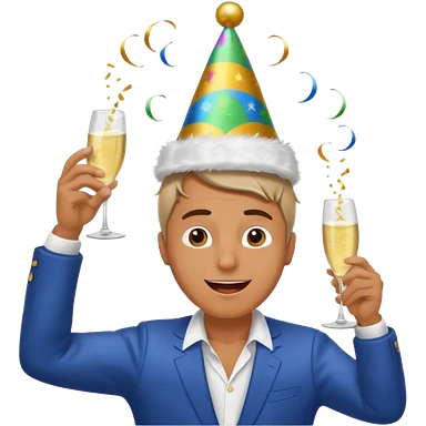 An energetic man throws his head back, drinking champagne loudly as the New Year begins. emoji