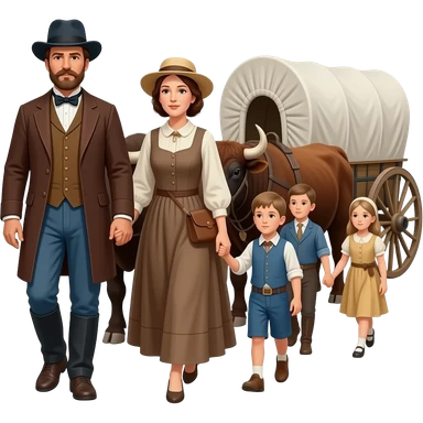 pioneer family with husband, wife, and children walking 1850 on the oregon trail facing sideways with covered wagon and oxen emoji