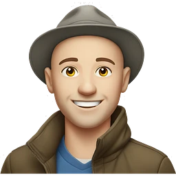 Bald man smiling with glasses and big bushy blac beard with. Wearing a white shirt and a blue coat emoji
