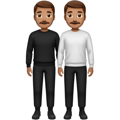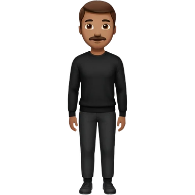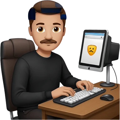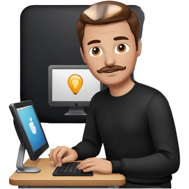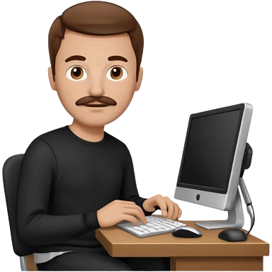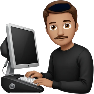man with mustache, brown hair, 33years old, shirt, high temple Black pullover with a white shirt underneath and black fabric trousers work with couputer emoji