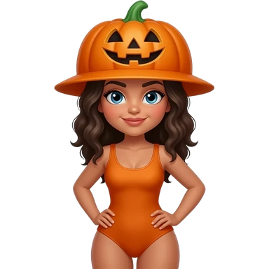 latina woman in one piece wearing a pumpkin hat emoji
