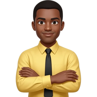 brown skinned man wearing a yellow long-sleeved dress shirt and black tie with his arms crossed emoji
