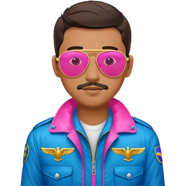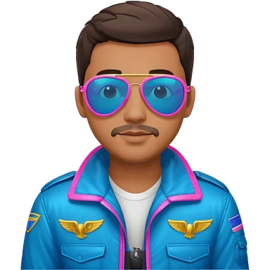 1980s cool man with stubble wearing reflective neon pink and blue aviator sunglasses and a pilot topgun jacket emoji