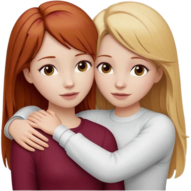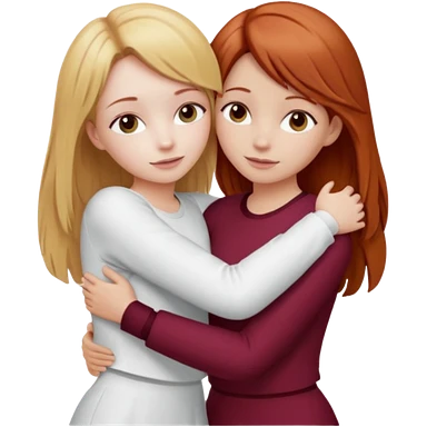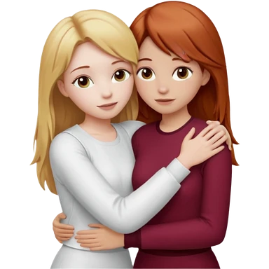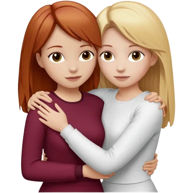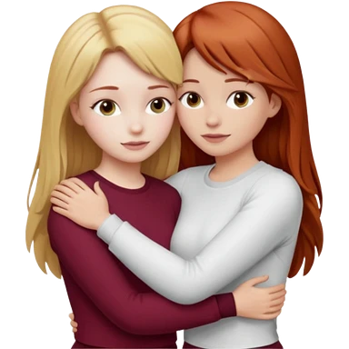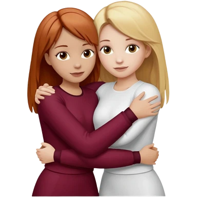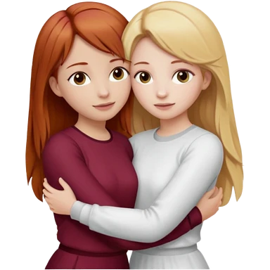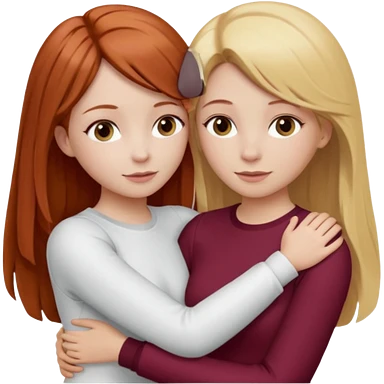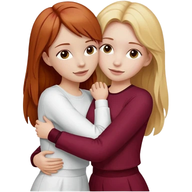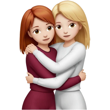 two girls who hug eachother. one has auburn hair with blonde highlights and very pale skin , other has medium-fair skin and blonde hair. girl with auburn or dark blonde hair is wearing a white outfit and girl with blonde hair is wearing a burgundy outfit emoji