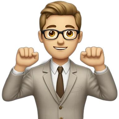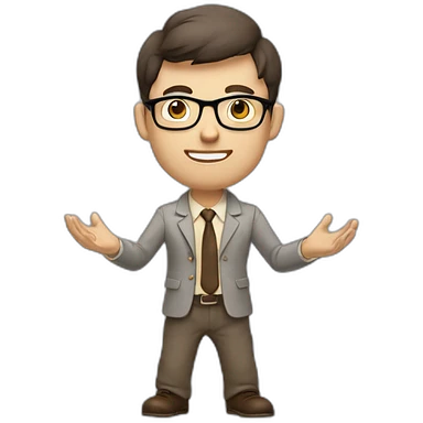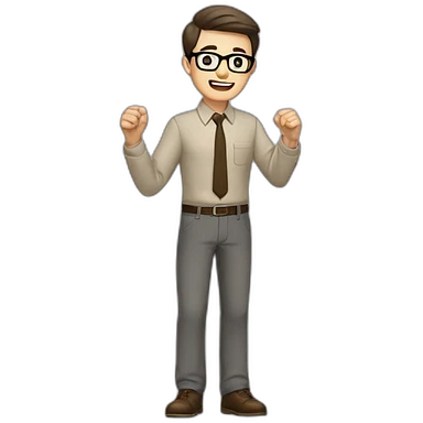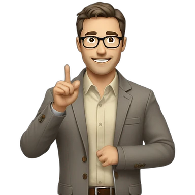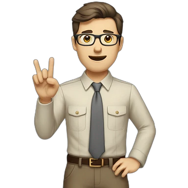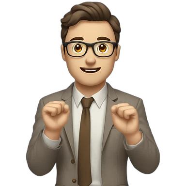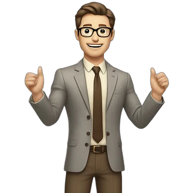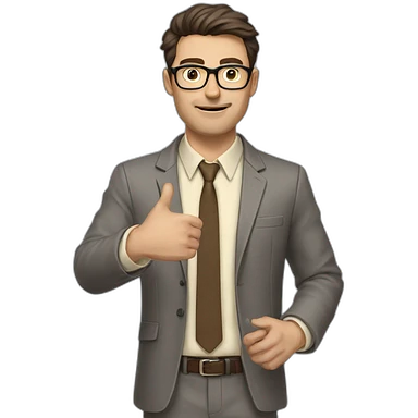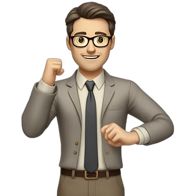 To belt Actively gesturing with hands Pale skinned fit man with dark brown hair in gray jacket, beige office shirt, brown tie, brown pants and vintage glasses. emoji