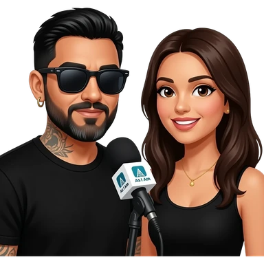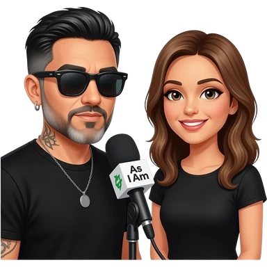 A podcast host, a handsome Latino man with medium hair, a graying beard, tattoos, hoops in his nose and ear, all in black with sunglasses, interviews a woman in front of a microphone with a logo reading "As I Am." emoji