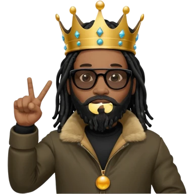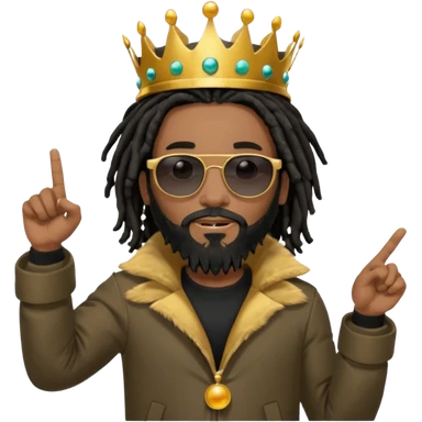 African American man with shoulder length black dreadlocks with black beard wearing black sunglasses wearing Crown on his head wearing a black bubble mens winter coat pointing at himself emoji