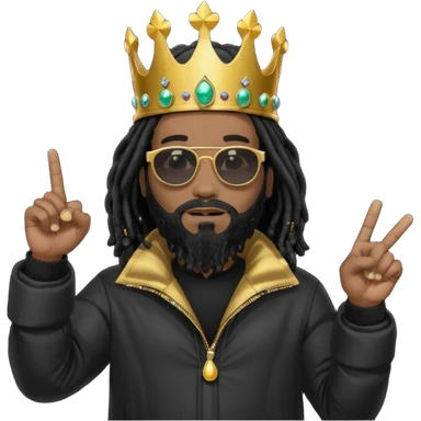 African American man with shoulder length black dreadlocks with black beard wearing black sunglasses wearing Crown on his head wearing a black bubble mens winter coat pointing to himself emoji
