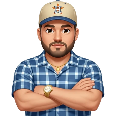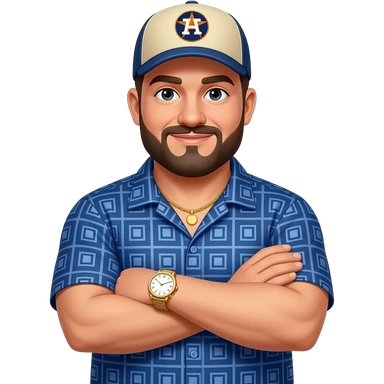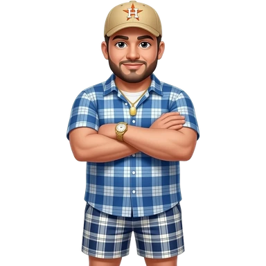 Chubby man with apricot skin tone with lightly shaved black beard wearing a blue button down short sleeve shirt with matching shorts with square pattern designs wearing an all beige color Huston Astros logo baseball cap wearing a gold tennis necklace and a gold wrist watch with arms folded emoji