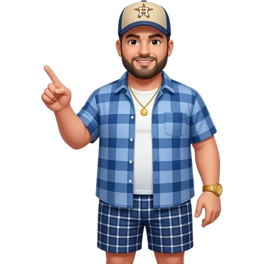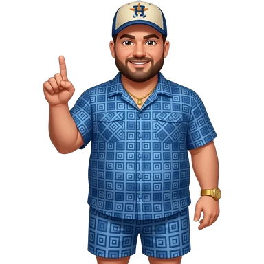 Chubby man with apricot skin tone with lightly shaved black beard wearing a blue button down short sleeve shirt with matching shorts with square pattern designs wearing an all beige color Huston Astros logo baseball cap wearing a gold tennis necklace and a gold wrist watch pointing finger up emoji