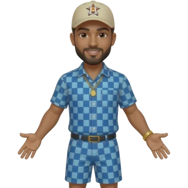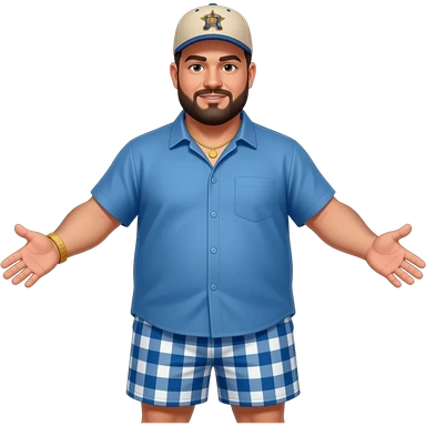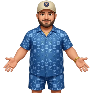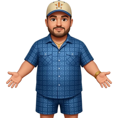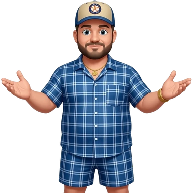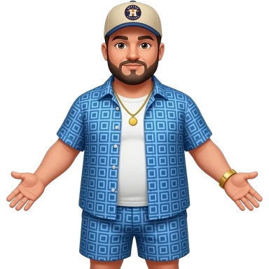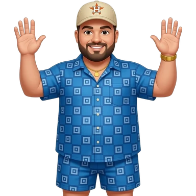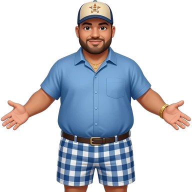 Chubby man with apricot skin tone with lightly shaved black beard wearing a blue button down short sleeve shirt with matching shorts with square pattern designs wearing an all beige color Huston Astros logo baseball cap wearing a gold tennis necklace and a gold wrist watch holding hands out emoji