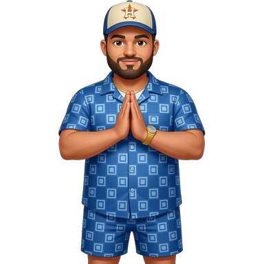 Chubby man with apricot skin tone with lightly shaved black beard wearing a blue button down short sleeve shirt with matching shorts with square pattern designs wearing an all beige color Huston Astros logo baseball cap wearing a gold tennis necklace and a gold wrist watch with prayer hands emoji