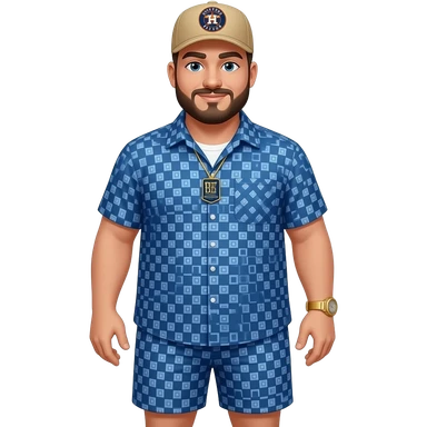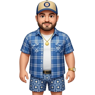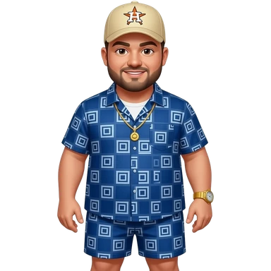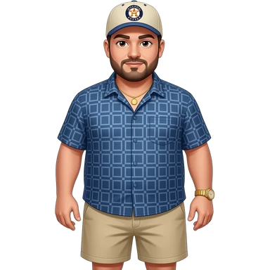 Chubby man with beige skin tone with lightly shaved black beard wearing a blue button down short sleeve shirt with matching shorts with square pattern designs wearing an all beige color Huston Astros logo baseball cap wearing a gold tennis necklace and a gold wrist watch emoji