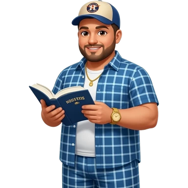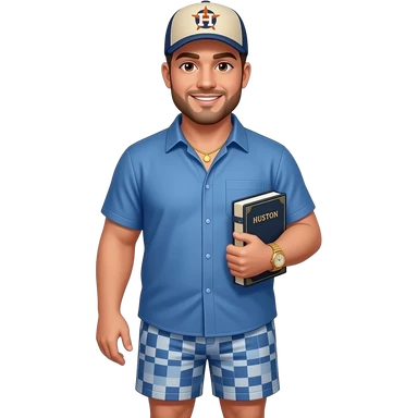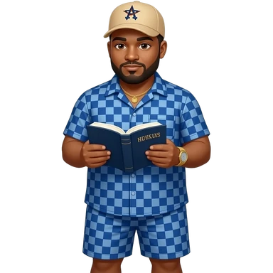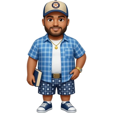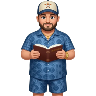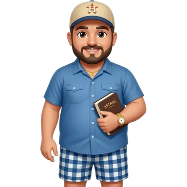 Chubby man with light honey skin tone with lightly shaved black beard and brown eyeswearing a blue button up short sleeve shirt with matching shorts with square pattern design wearing a beige Huston Astros logo baseball cap wearing a gold watch wearing a gold tennis necklace reading the Bible emoji