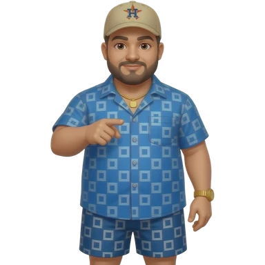Chubby man with apricot skin tone with lightly shaved black beard wearing a blue button down short sleeve shirt with matching shorts with square pattern designs wearing an all beige color Huston Astros logo baseball cap wearing a gold tennis necklace and a gold wrist watch pointing finger out emoji