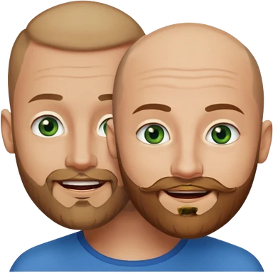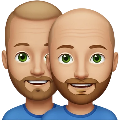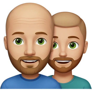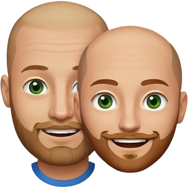 Shaved head man with dark blonde beard and blue eyes with mouth closed smile with brown haired woman with green eyes emoji