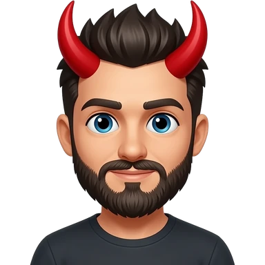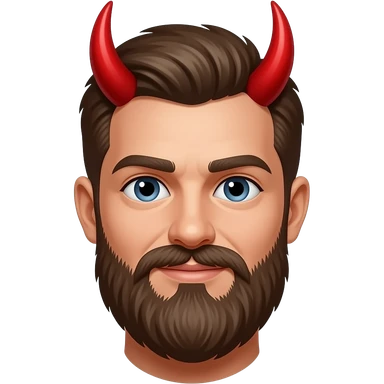 a chubby, round faced caucasian man smiling with dark brown hair, mustache and short beard, smiling mischeiviously with little devil horns barely visible poking up from under the hair. emoji