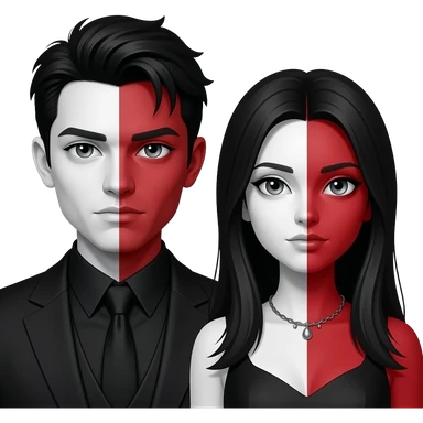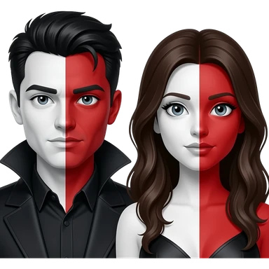 Gothic man and woman both with half white and half red face. Both have silver eyes and dark hair emoji