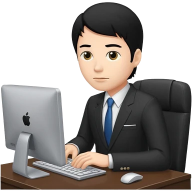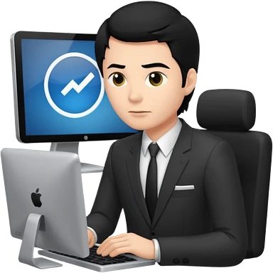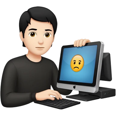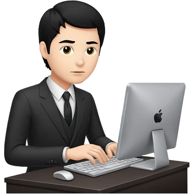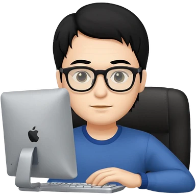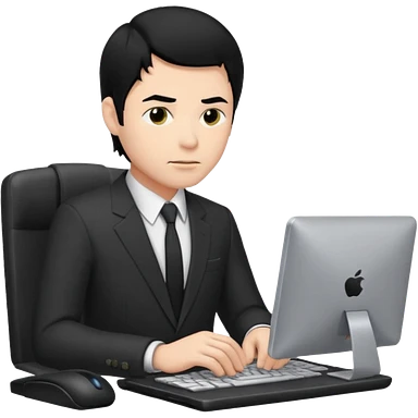 Emoji-style adult man coding at a PC on a black chair and table. Modern 3D emoji look, clean and expressive. emoji