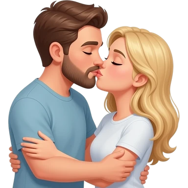 Man with brown hair and beard kissing blonde woman. The woman is wearing a T-shirt emoji | AI Emoji Generator