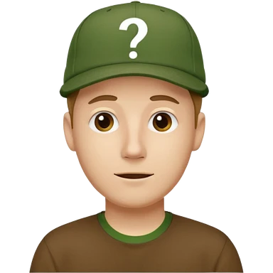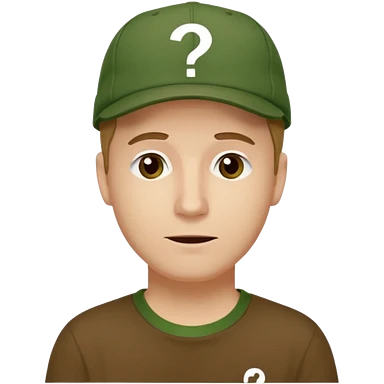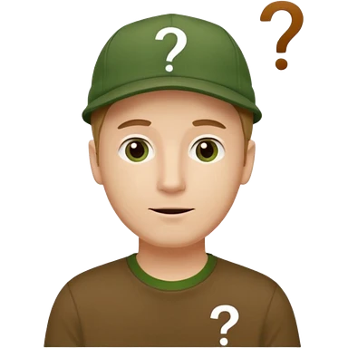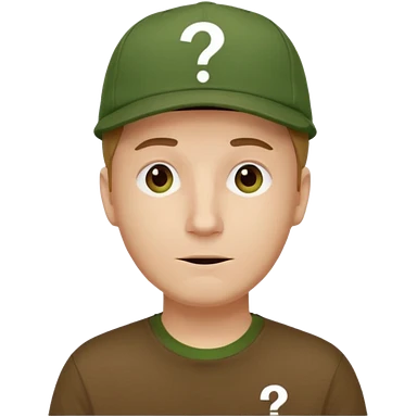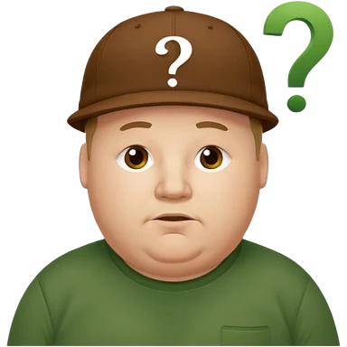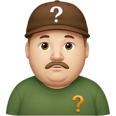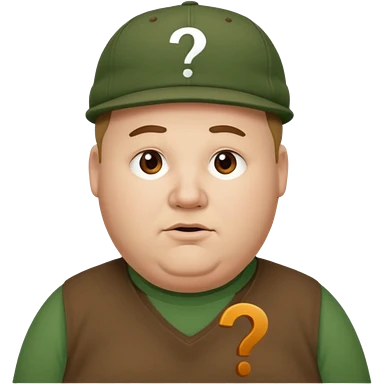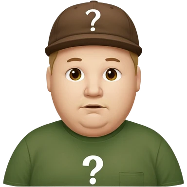 white fat man with brown cap and green t shirt printeed a question mark emoji