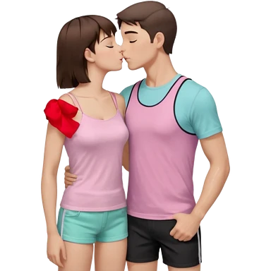 A couple, mid-20s, standing close and kissing. Man: short brown hair, clean-shaven, wearing a plain pastel pink t-shirt and dark shorts. His left arm is wrapped around the woman’s waist. Woman: long straight brown hair, wearing a black sleeveless glittery top with thin straps and a black skirt. emoji