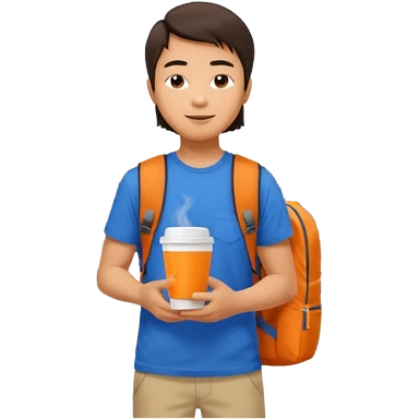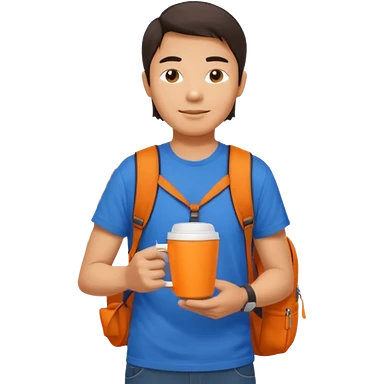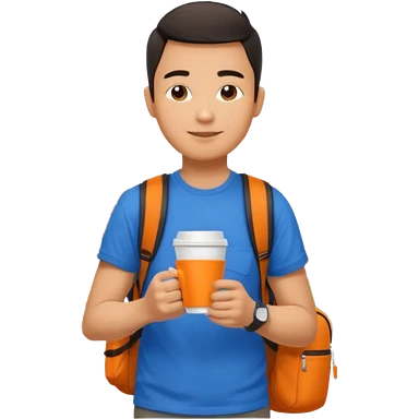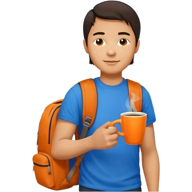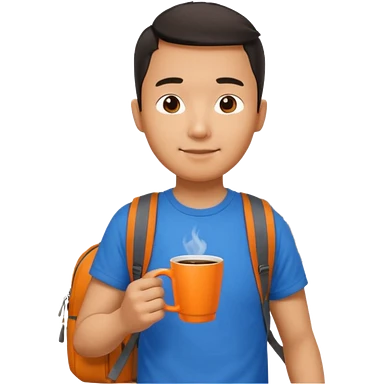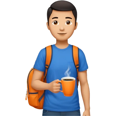 an asian man in blue t-shirt with orange cup of coffee and backpack on the back. Eiffel tower on the background. shoulder length picture emoji