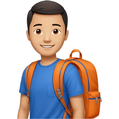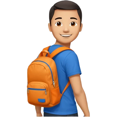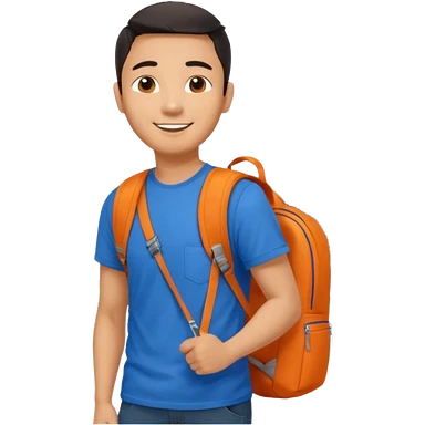 an asian man in blue t-shirt with orange backpack on the back. Eiffel tower on the background. shoulder length picture emoji