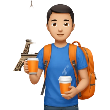 an asian man in blue t-shirt with orange cup of coffee and backpack on the back. Eiffel tower on the background emoji