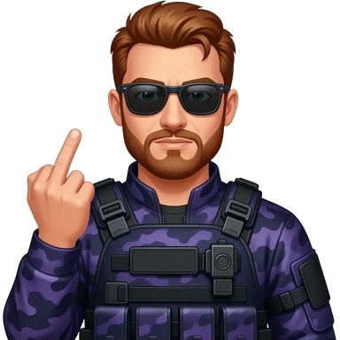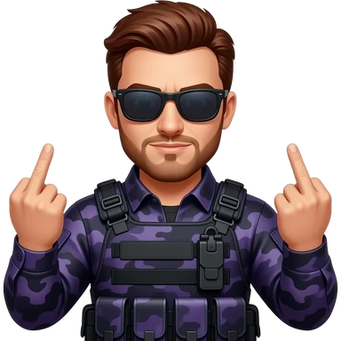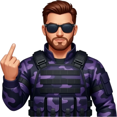Man with dark reddish brown hair a five o clock shadow beard sunglasses and dark purple camoflage tactical gear giving the finger emoji