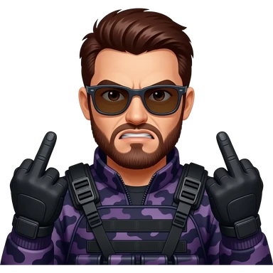 Angry Man with dark reddish brown hair a five o clock shadow beard brown eyes sunglasses and dark purple camoflage tactical gear giving the finger two times emoji
