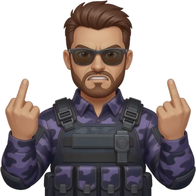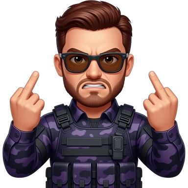 Angry Man with dark reddish brown hair a five o clock shadow beard sunglasses and dark purple camoflage tactical gear giving the finger two times emoji