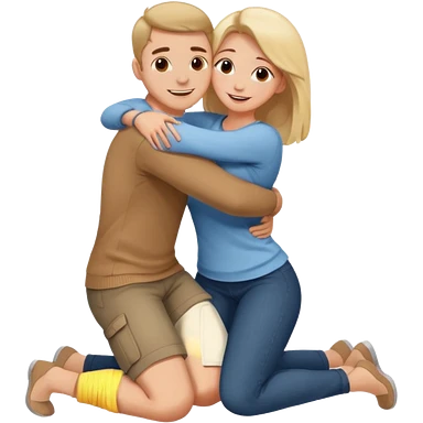 man with dark hair on knees, facing dark haired standing woman, hugging her waist emoji