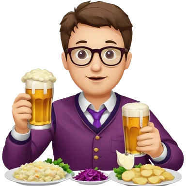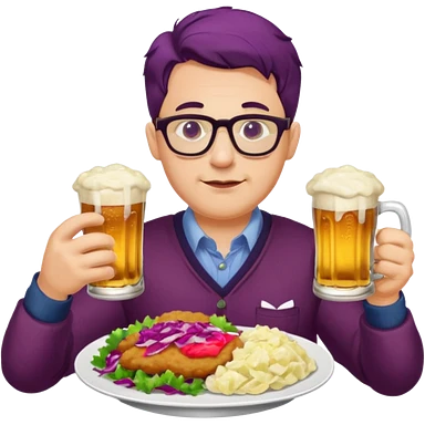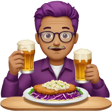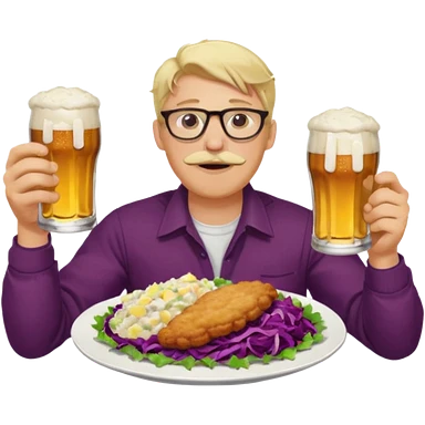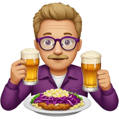 Man with glasses german eating schnitzel, red cabbage, sauerkraut, potato salad, and beer emoji | AI Emoji Generator