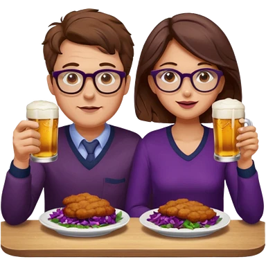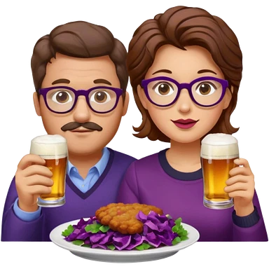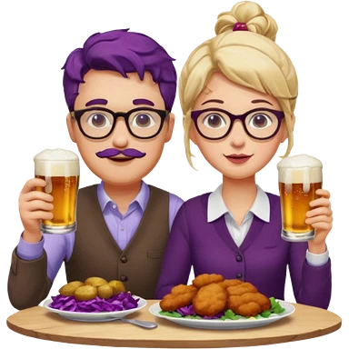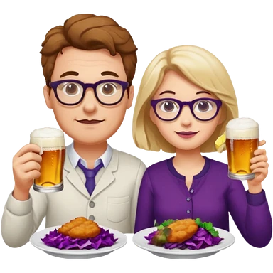 German man with glasses and brown hair and woman with glasses and brown hair eating schnitzel, red cabbage, potatoes, and drinking a beer emoji