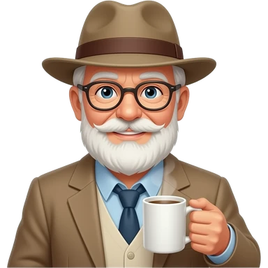 old man with hat and hold coffee mug in his left hand and visisble coffee emoji