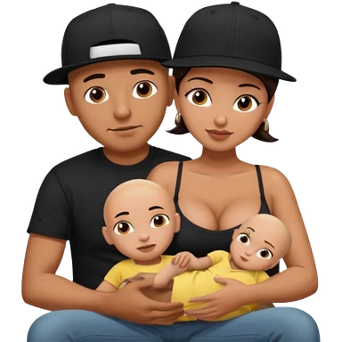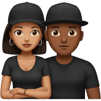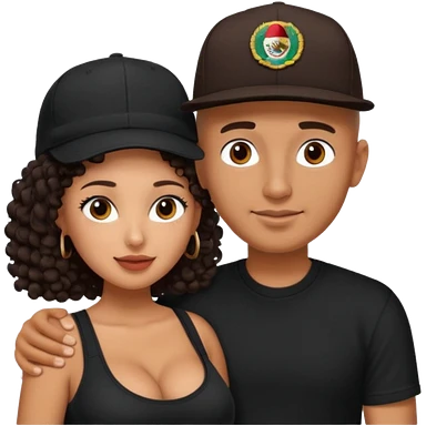 A picture of an embracing tanned couple. the man is a Mexican man with tanned skin, with a bald hair cut wearing a SnapBack hat and a black shirt. the woman has curly longer dark brown hair, thick and with big boobs emoji