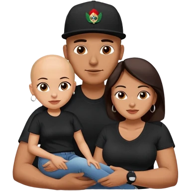 A picture of an embracing tanned couple. the man is a Mexican man with tanned skin, with a bald hair cut wearing a SnapBack hat and a black shirt. the woman is mixed, she has curly longer dark brown hair, thicker and with big boobs and she has glasses emoji
