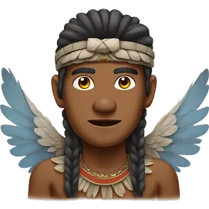 An old man with a beard, with two wings, with one hand raised for worship and a ring in the other hand, with three feathers and rows of feathers in each wing, and a skirt with three rows of feathers. emoji